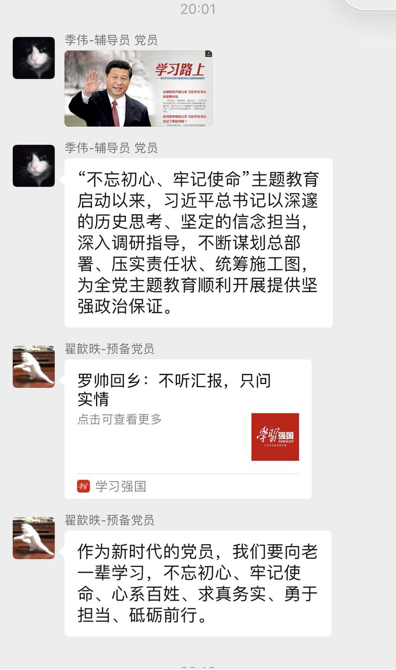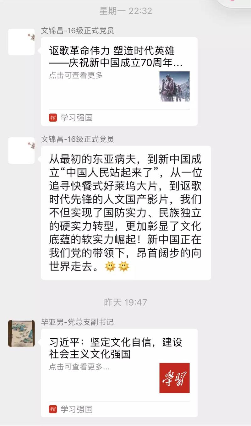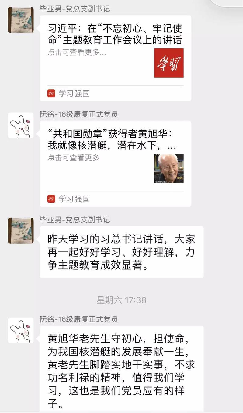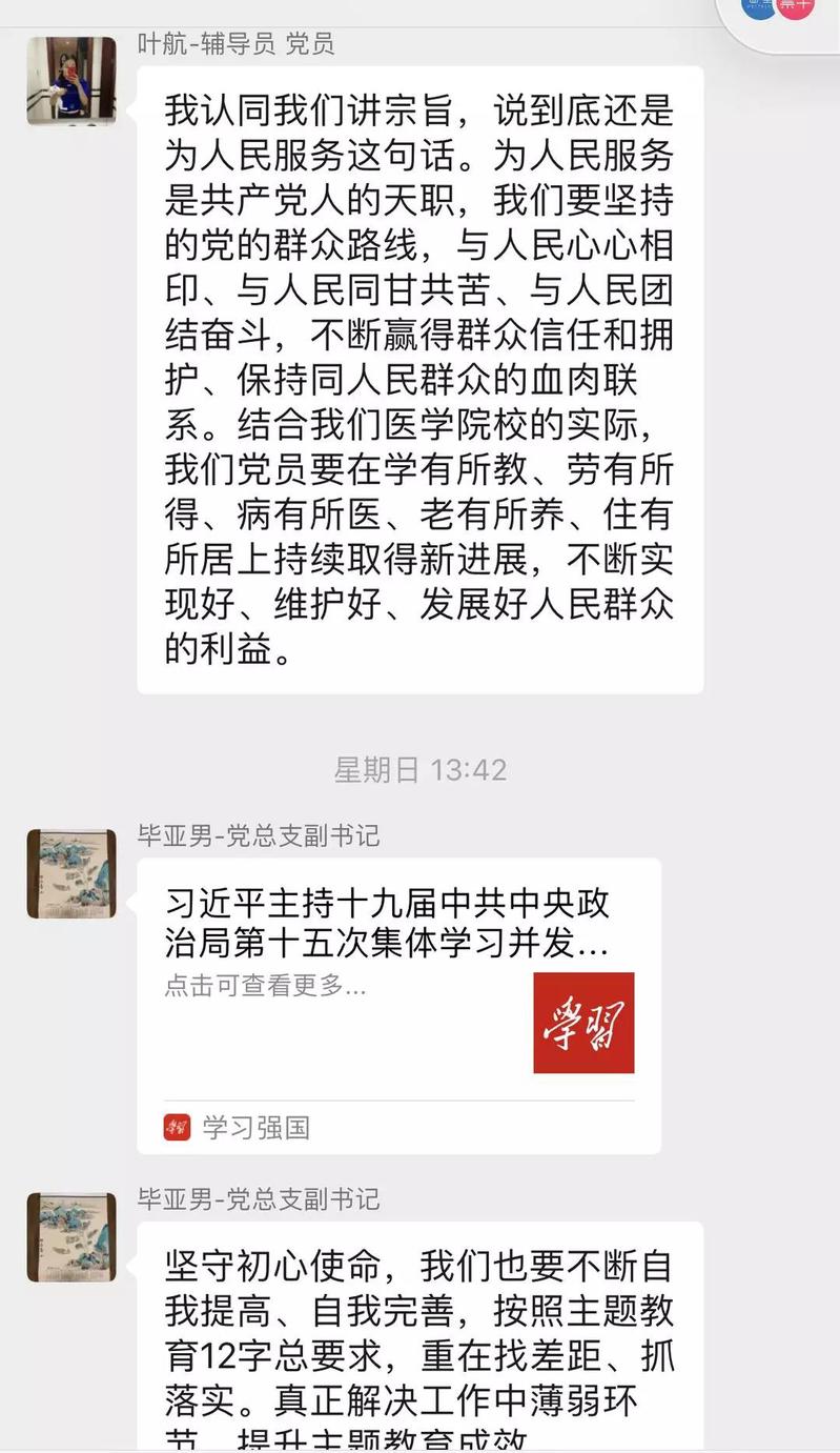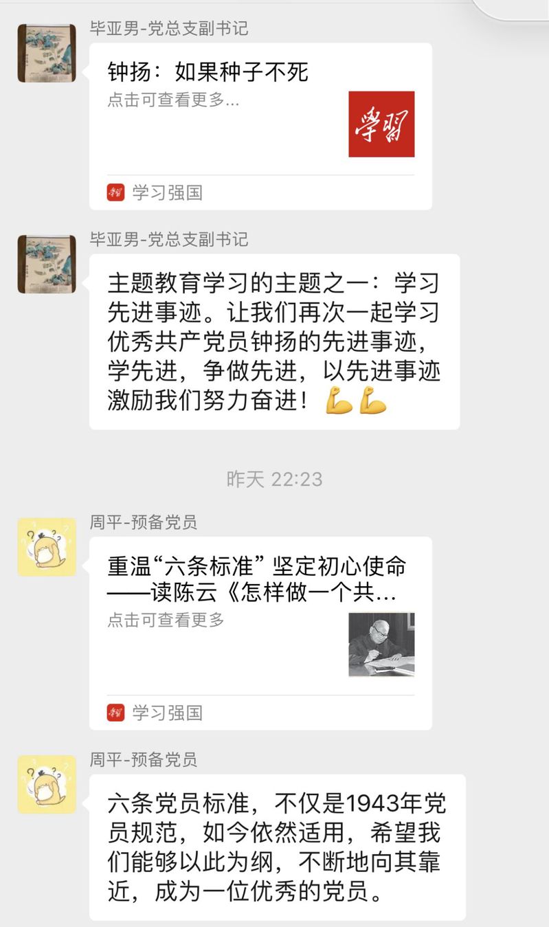 伟德国际VICTOR1946员工党支部的党员构成是以本科高年级员工党员及辅导员为主,创新学习研讨方式,既打破了主题学习的时间、空间局限;又有效利用了“学习强国”平台学习主题教育相关内容,增进了党支部成员的沟通。