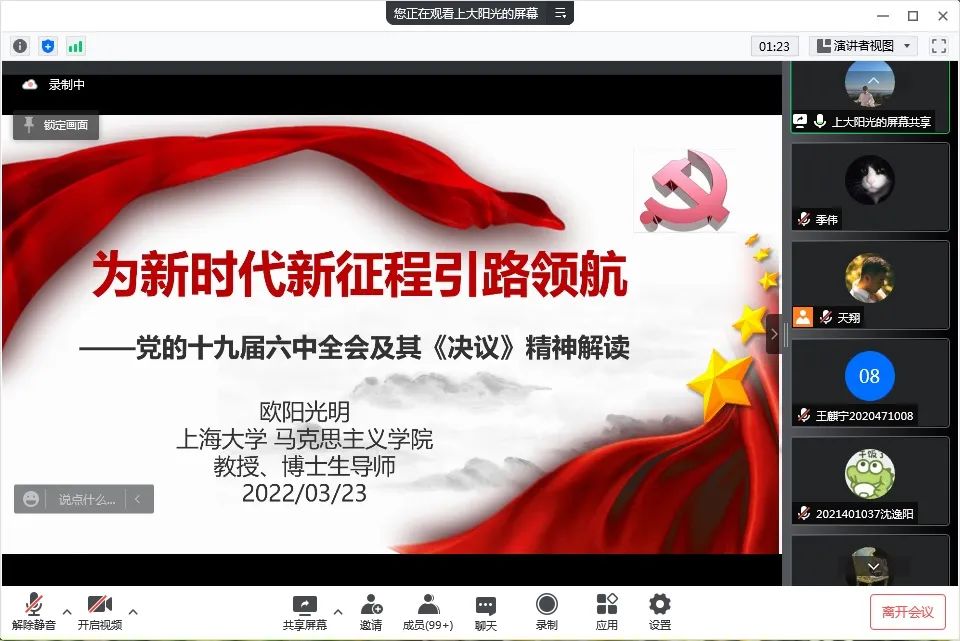 为喜迎党的二十大,热烈庆祝中国共产主义青年团成立100周年,引导新时代青年老员工发扬光荣传统、勇担强国使命,2022年3月23日下午,伟德国际VICTOR1946举办了“跨界协同育人共同体——服务员工成长导师团”专题学习活动暨“追梦大讲堂”主题讲座。公司导师团校外导师、上海大学马克思主义公司欧阳光明教授以“为新时代、新征程引路领航——党的十九届六中全会及其《决议》精神解读”为题为全院员工开展线上讲座。伟德国际VICTOR1946师生党员、入党积极分子等带头积极参加了活动,并邀请了部分兄弟公司的教师党员和员工党员共同参加了活动,讲座由导师团导师、员工党支部书记周家伟主持。