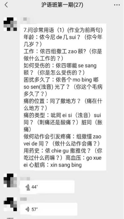 公司导师团导师、青年教师班主任柏怡文老师特聘了两位正宗的上海话的老师,我们身边最热心的上海同学朋辈辅导,在19级率先开始了第一期的沪语培训班,进行了为期10天的沪语培训。从最基础的称呼与问候,到基本的身体部位,再到医患沟通中的专业术语,康复特有的词汇,都应有尽有。