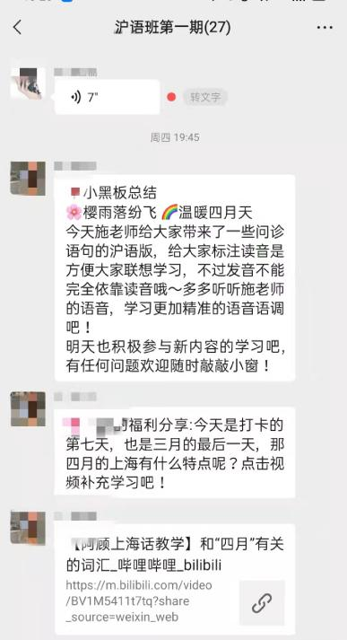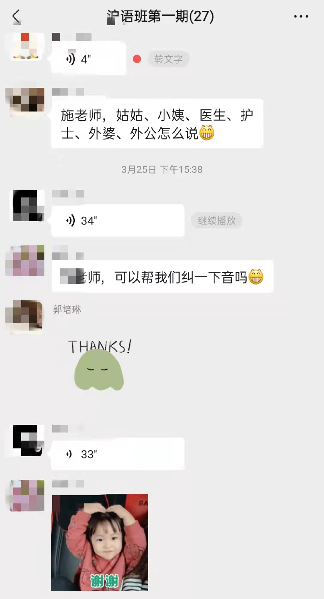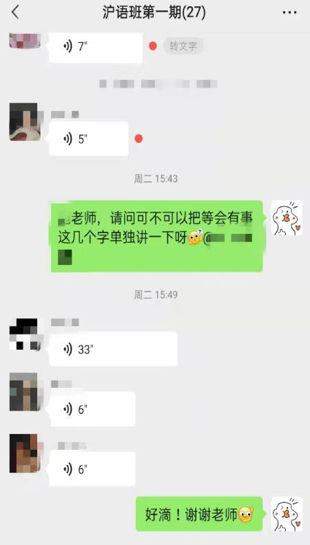 同学们担心是否与校内课程或公司活动冲突?完全不用担心!沪语班课堂采用“随听随学”的教授形式。老师会把每人所学的文字版与语音版发到群里,同学们可以自行安排学习时间,更有老师线上答疑拓展。
