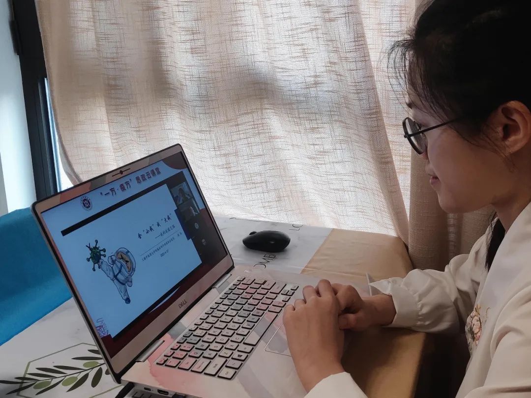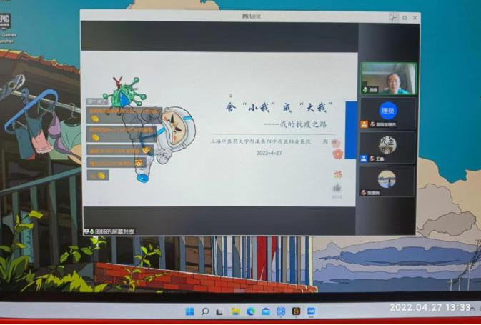 我们天各一方,却都在寻找“疫方”。在今天的思政云课堂中,周扬主任以家国为中心,分享自己舍“小我”成“大我”的抗疫之路,从自己支援疫情前线的经历说起,对家乡的牵挂和担心,作为医者的责任与决心,对应用中医解决问题的信心正是老师义无反顾的初心。中医药具有悠久的防疫治瘟历史,临床实践丰富。上海是一座开明睿智、海纳百川的城市,更是一座英雄的城市。这次大范围的抗疫行动中,作为中医药人,我也积极报名了基层疫情防控志愿者,参与核酸检测的采样、在楼栋里分发抗原试剂、做好扫楼等工作。未来我们继续运用好、传承好、发展好、创新好中医药这一瑰宝,让青春在抗疫、在中医药事业中闪闪发光,展现岐黄追梦人的风姿!