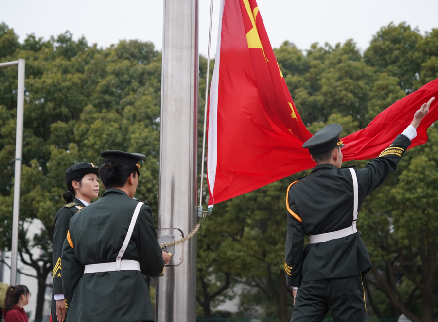 升旗仪式开始,国旗护卫队迎着东方日出的方向,迈着整齐的步伐,意志坚定,目光炯炯,护送国旗入场。师生行注目礼,奏唱中华人民共和国国歌,五星红旗缓缓升起。