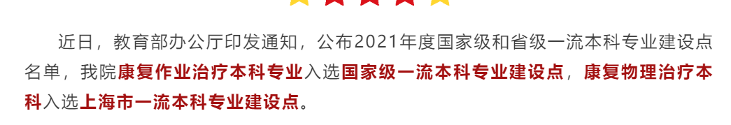 3.2021年,康复作业治疗本科专业入选国家级一流本科专业建设点,康复物理治疗本科入选上海市一流本科专业建设点。
