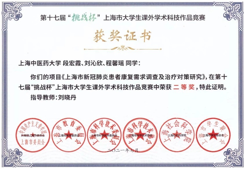 ②2021年,获第十七届“挑战杯”上海市老员工课外学术科技作品竞赛二等奖。