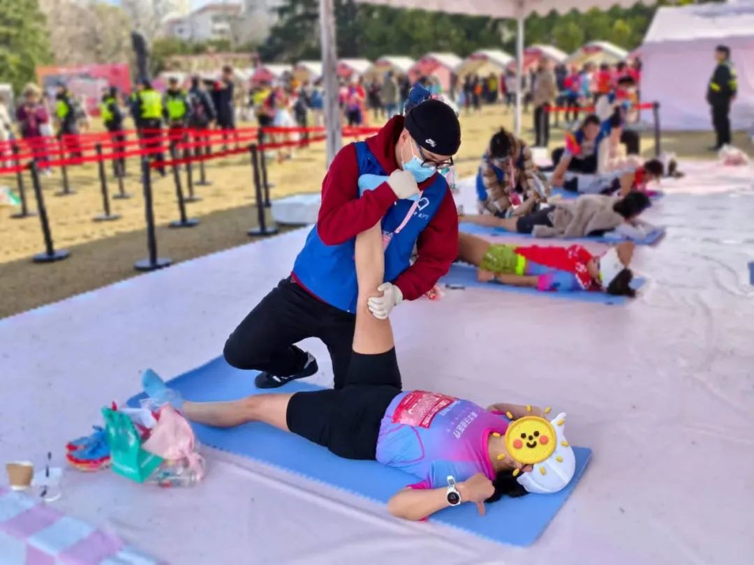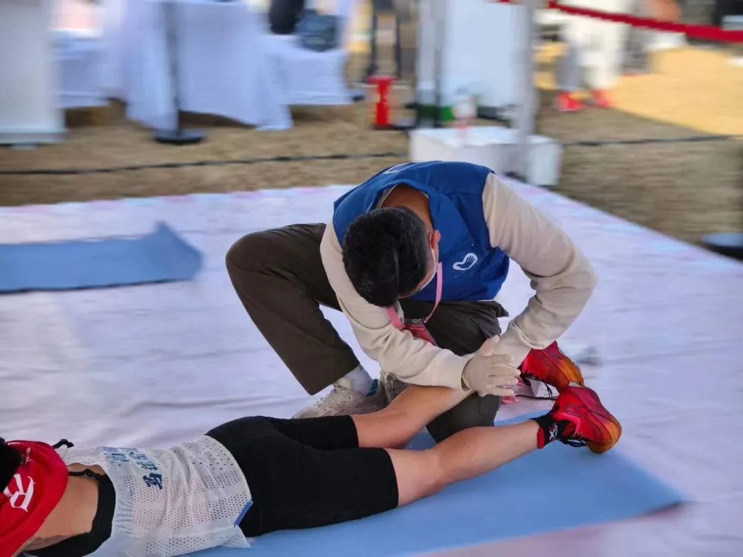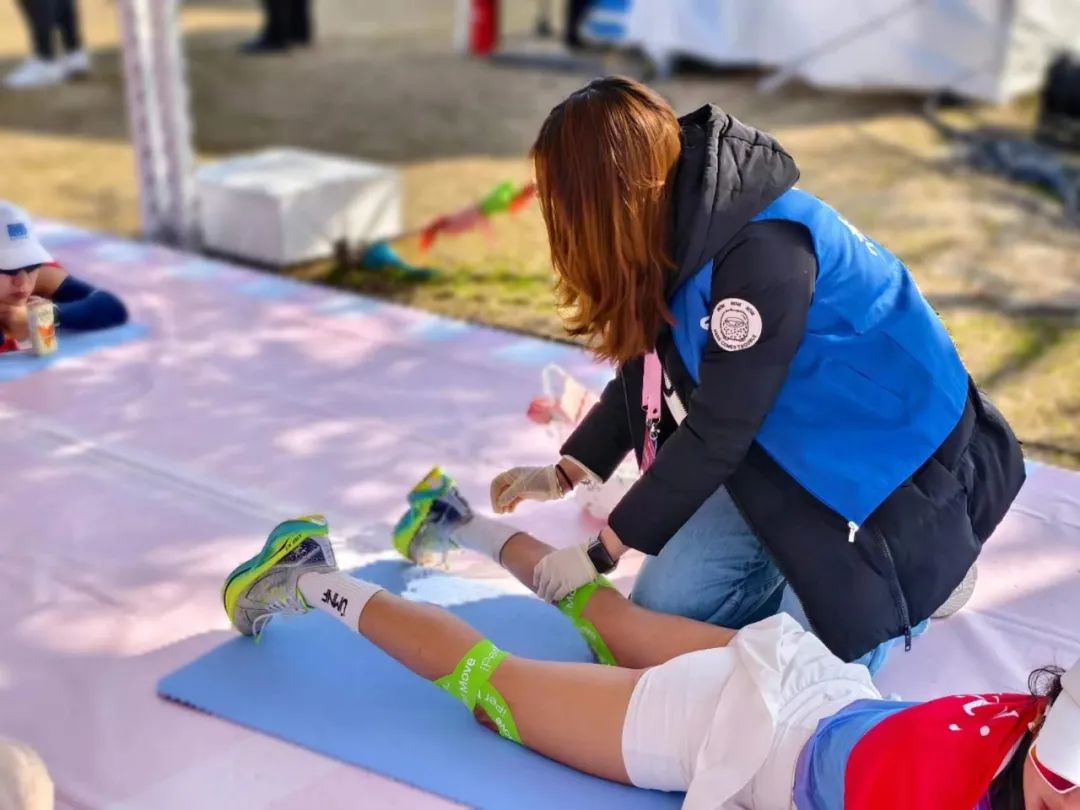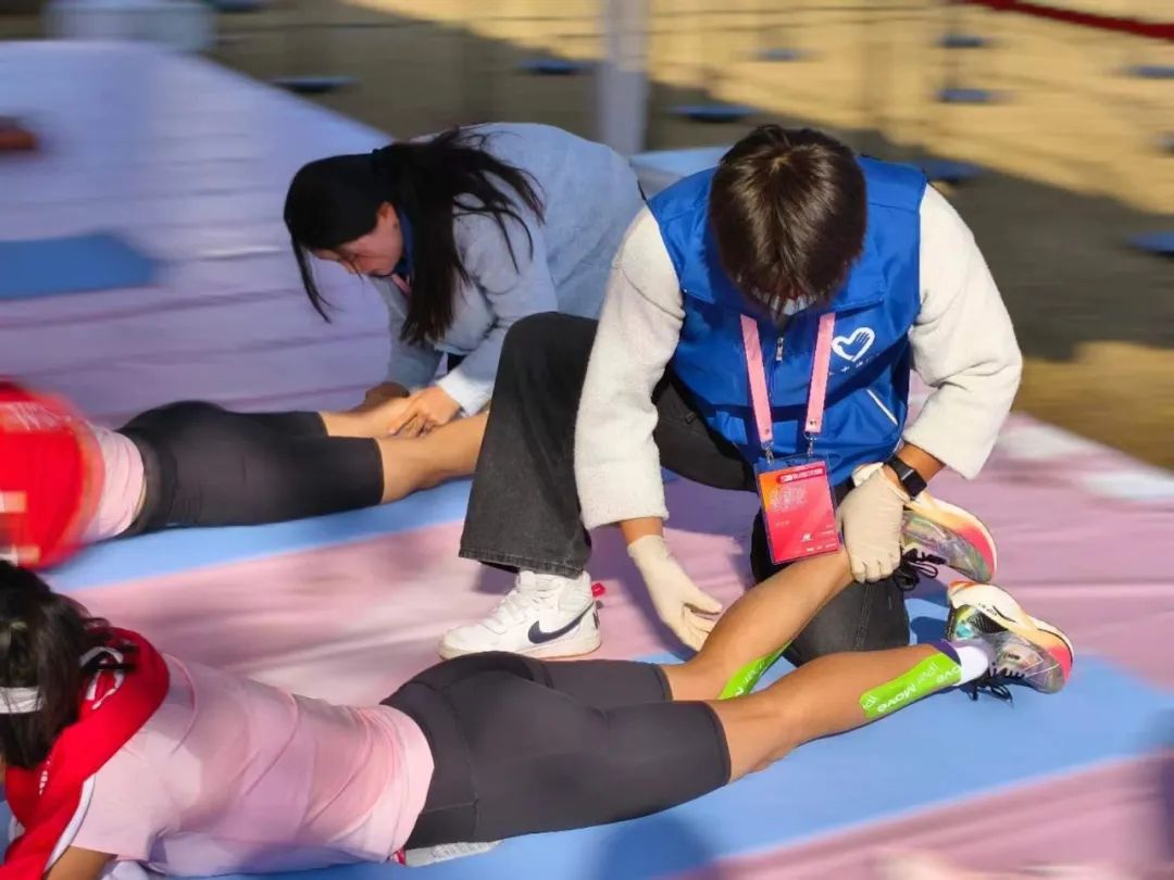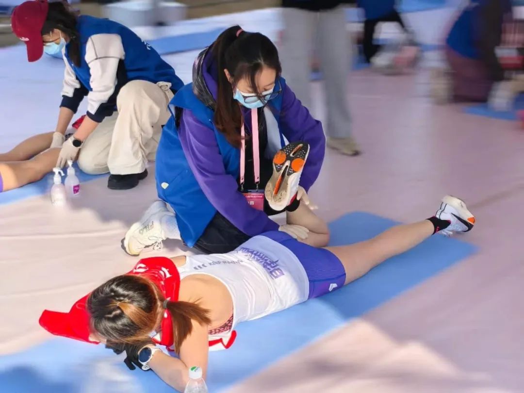 当选手们冲过终点,身体的疲惫和肌肉的紧张需要得到及时的缓解。这时,伟德国际VICTOR1946的同学们便成了她们最贴心的守护者。他们运用所学的康复治疗知识,为选手们进行科学的肌肉牵伸,帮助她们放松紧绷的肌肉,缓解疼痛,预防运动损伤。每一根手指的力度都恰到好处,每一个动作都充满关怀,他们的专业和细心赢得了选手们的广泛赞誉。
