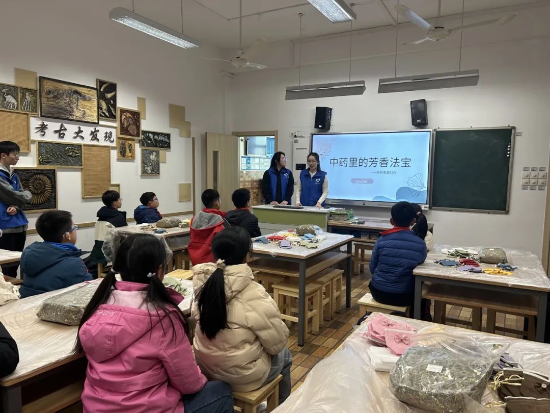 志愿者们首先向小员工们介绍了香囊在中华传统文化中的重要意义。随后,志愿者们详细讲解了三种香囊——防蚊驱虫、防疫避秽、悦脾开胃香囊的功效及其中药配伍,并示范制作香囊的步骤,进行教学。
