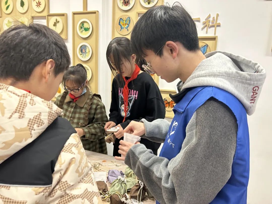 小员工们兴趣盎然地动手制作自己的香囊。他们认真地将香料填充到内胆中,用丝带系紧,再放入精美的香囊袋中。孩子们相互交流、分工合作,共同完成了一个个饱满可爱的香囊,成就感满满。