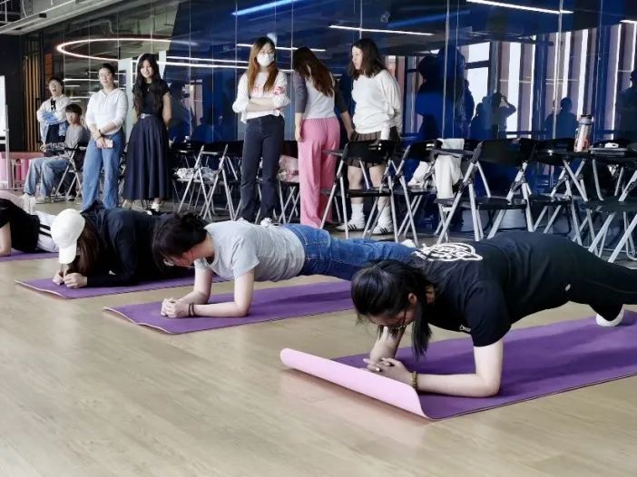 在互动环节中,刘垚经理和健身教练郑思念老师带领同学们通过简单的测试对自己的体能状况进行了评估。评估涵盖了上、下肢力量与耐力、核心控制与力量以及柔韧性等。在评估过程中,两位老师强调了动作正确的重要性,针对同学的错误动作进行了指正,同学们也积极配合参与,现场气氛热烈有序。