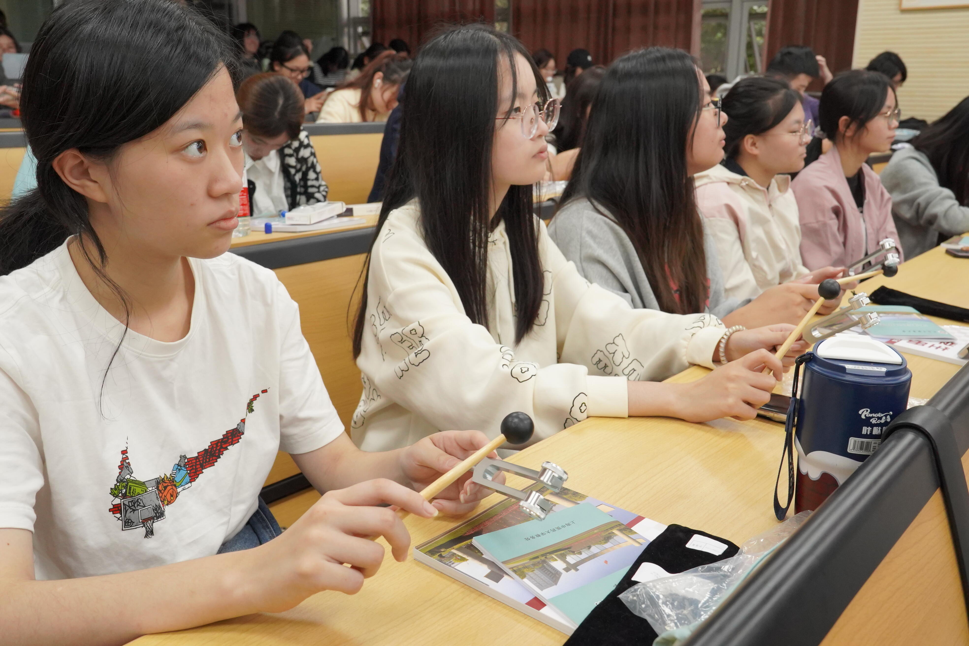 随后,刘建菊老师手持音叉,向同学们展示了如何利用音叉进行听力相关的诊断测试,还强调了在实际操作中需要注意的事项,以及如何与患者沟通以获得准确的测试结果。