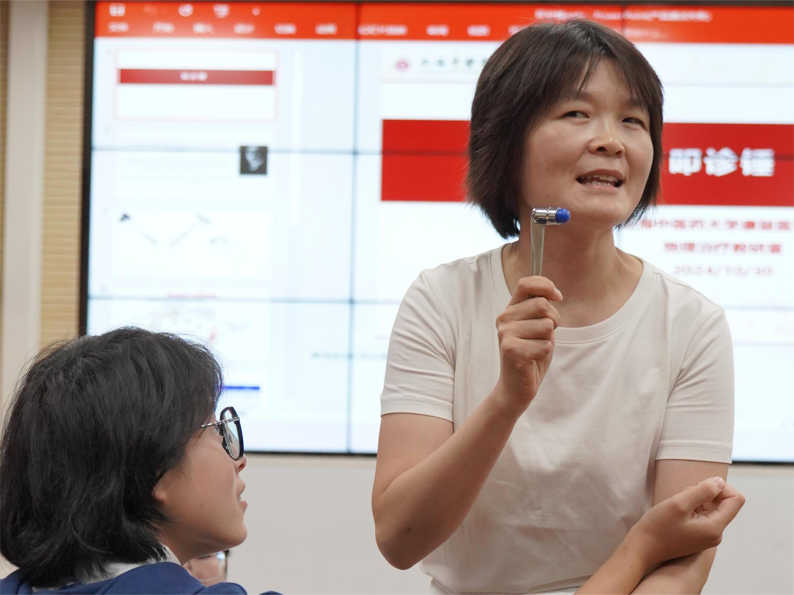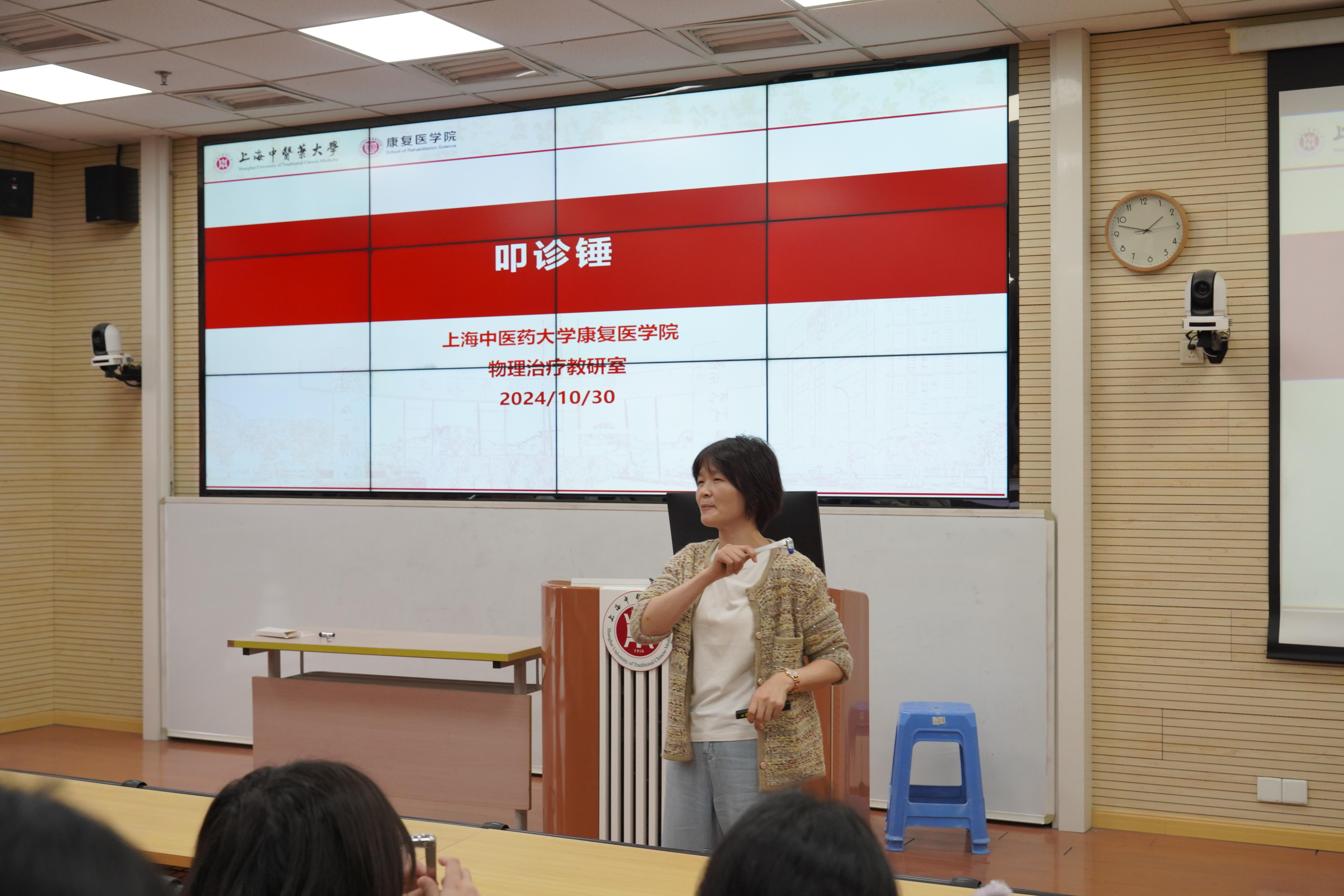 首先,张彩老师向大家介绍了叩诊锤的用途和使用方法,随后她亲自手持工具,演示了若干神经肌肉反射检查的技术,并对操作的细节进行了详尽的解释和示范,以确保同学们能够完全理解并熟练掌握。