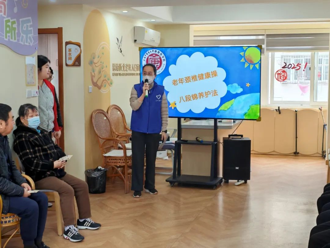 在游园会的第二部分,王逸欣同学向老人介绍了八段锦的动作要领,并带领老人在充分热身后体验了八段锦。过程中有一位奶奶是公认的八段锦学霸,可以脱离视频完整的打完一套八段锦,大家对她赞不绝口。在志愿者们的带领下,爷爷奶奶们都非常认真地跟着视频学习并且热身。