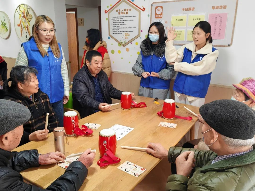 ④腰鼓逢7必过:老人分组参加游戏,从数字1开始数数,每人数一个数字,在到含7或者是7的倍数的时候要敲打腰鼓代替,反应慢了或者说错则失败,顺利数到80即为成功。