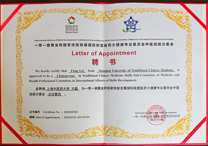 2025年3月,伟德国际VICTOR1946方磊教授在厦门一带一路暨金砖国家技能发展与技术创新大赛医药大健康类赛项竞赛规程与标准制定会议暨未来技术技能与人文交流人才国际训练基地(金砖工坊)建设工作会议中取得重要学术突破。在一带一路暨金砖国家技能发展国际联盟医药大健康专委会成立大会上,方磊教授受聘为首届中医技能分委会主任委员,标志着中医药国际化发展迈出关键一步。