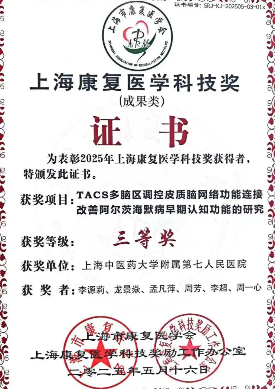 中医智能康复教育部工程研究中心李源莉副研究员团队(兼附属七院康复医师)申报的“TACS多脑区调控皮质脑网络功能连接改善阿尔茨海默病早期认知功能的研究”获科技成果类三等奖。项目围绕阿尔茨海默病认知障碍非侵入脑调控技术开展研究工作,旨在实现特定频率、多脑区、协同调控对于阿尔茨海默病非药物治疗的突破。李源莉副研究员长期致力于脑病康复的中西医融合神经调控技术应用的基础与临床研究,发表30余篇本领域研究论文。