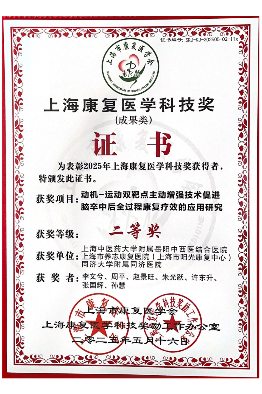 2025年5月16日下午“第十五届上海康复医学科技奖励大会暨标准引领康复新质生产力高质量发展研讨会”在上海美丽园酒店隆重召开,旨在奖励在上海康复医学事业发展进程中做出卓越贡献的个人和团队。公司康复团队和个人获多项殊荣。