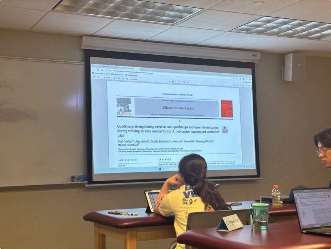 6⽉2⽇,Dr.Martin给我们介绍了康复评估中读姿势、步态、关节活动度、柔韧性和肌⼒评估相关的内容,这与我们之前所学的⼈体运动学和康复物理治疗评估的内容密切相关。在课上,我们两两分组,为同伴评估体态姿势,通过前、侧、后视图观察对称性、⾝体垂线对⻬进⾏评估,我们也通过观察不同同学的步态针对他们的问题进⾏分析、诊断,这为我们今后在⼯作中为患者进⾏评估诊断提供了思路和基础。
