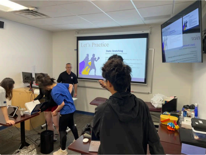 6 ⽉ 16 ⽇,Martin 教授为我们讲述了热⾝与柔韧性训练的相关知识。从中我们了解到热⾝运动的作⽤,影响个体灵活性的因素 ,并理解掌握各种拉伸技巧及原理。课堂中 ,Martin 教授让我们与同学互相练习 ,操练⼿法。