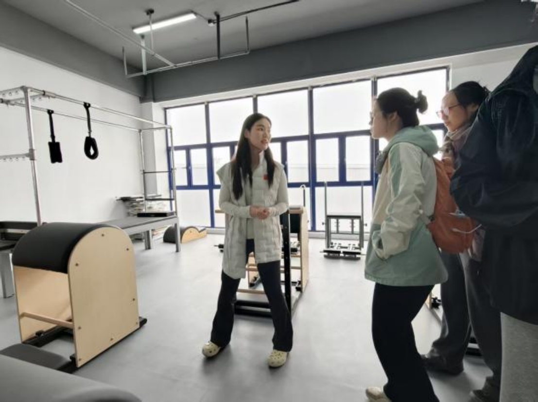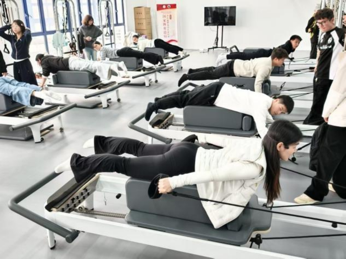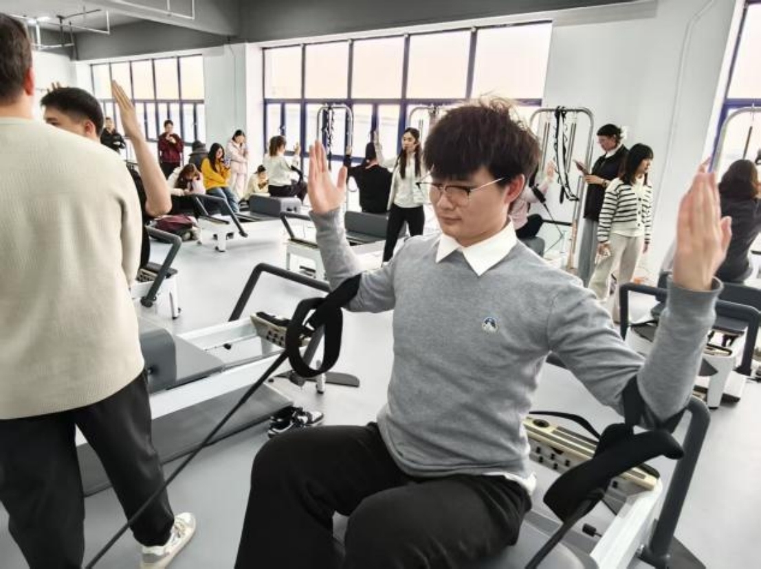 评估环节结束后,孙老师带领同学们在普拉提训练床开展专项抗阻训练。通过调整不同体位,配合弹力绷带的阻力作用,刺激和强化全身肌肉。三轮训练下来,同学们在专业指导下完成了多维度的身体激活,体验到普拉提训练对肌肉力量与身体控制能力的提升效果。