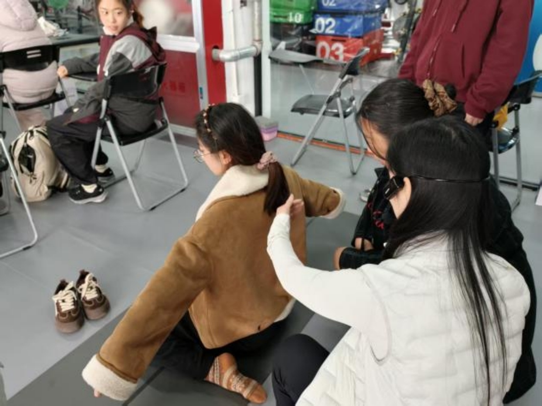 在Z字腿坐姿评估中,同学们重点感受髋关节内外旋肌肉的功能状态。孙老师指出部分同学表现出不经意的脊柱弯曲,随即现场纠正指导,强化同学们对评估动作细节的把控。