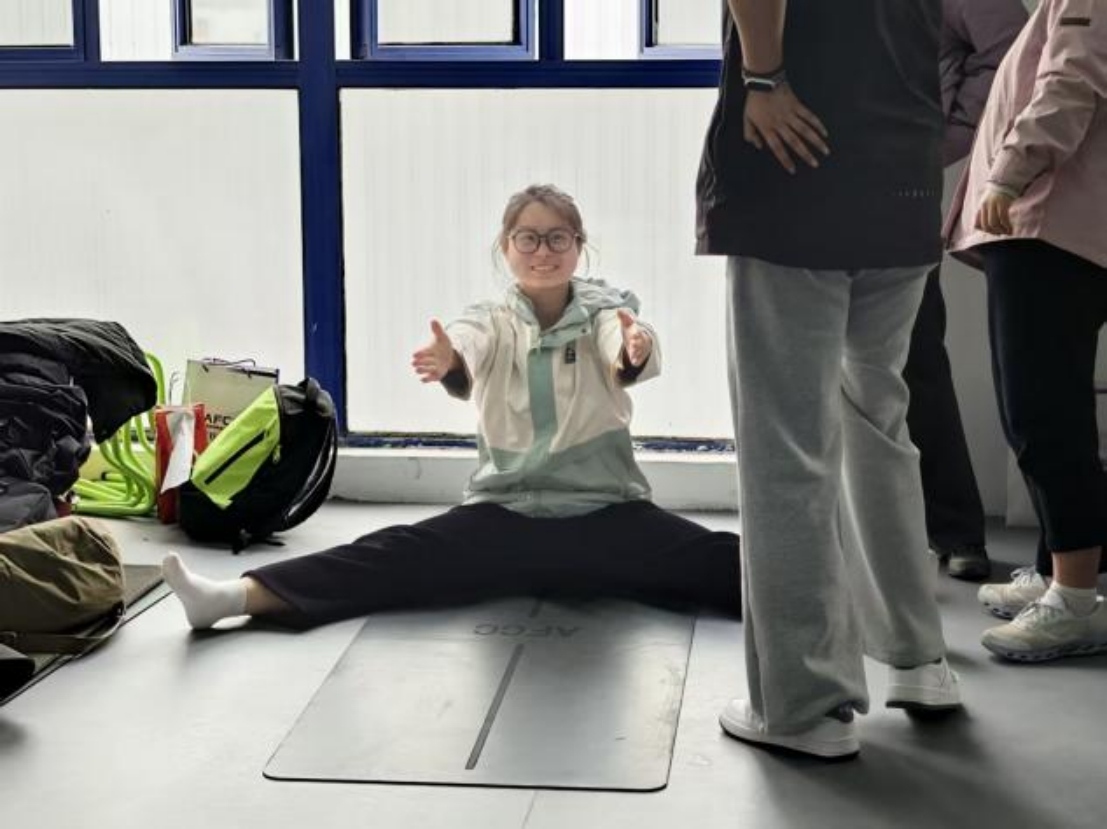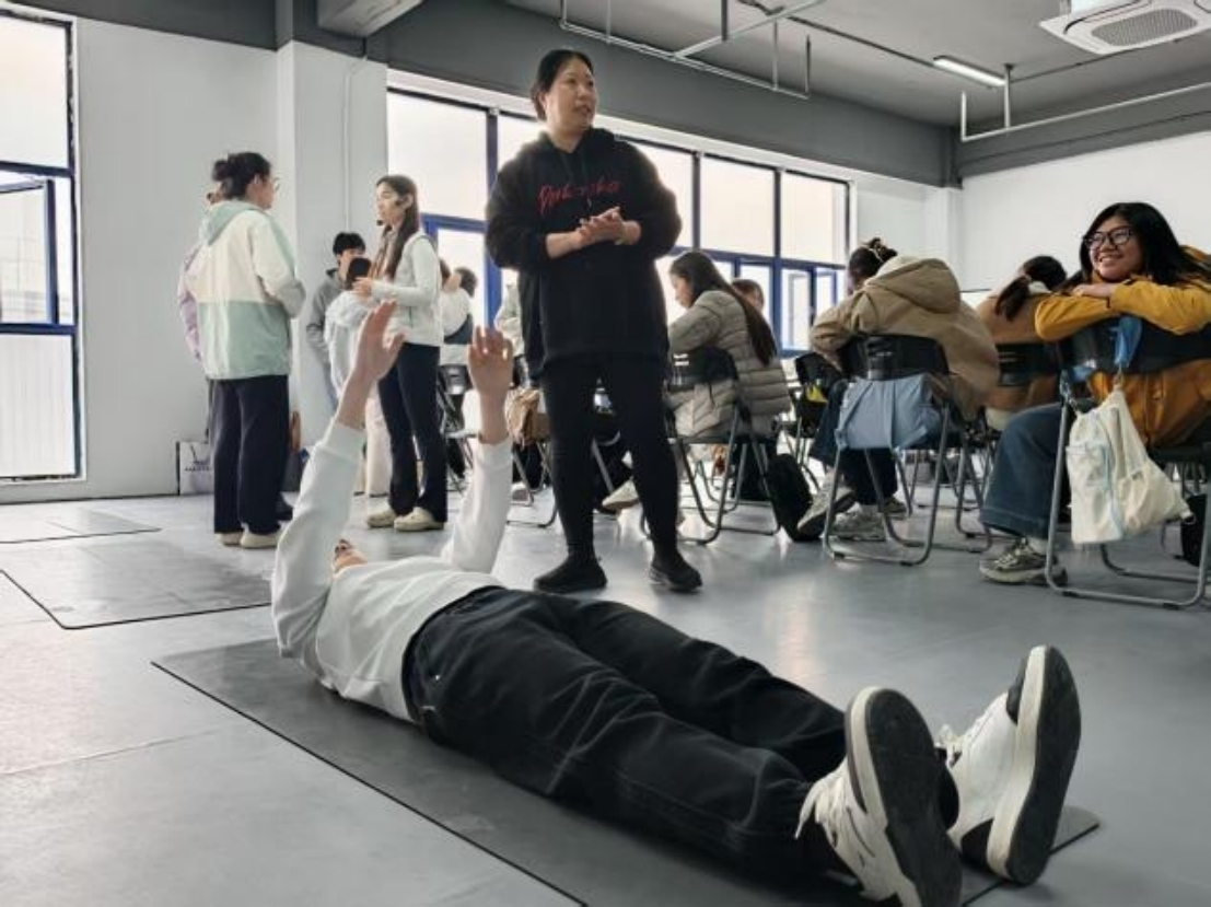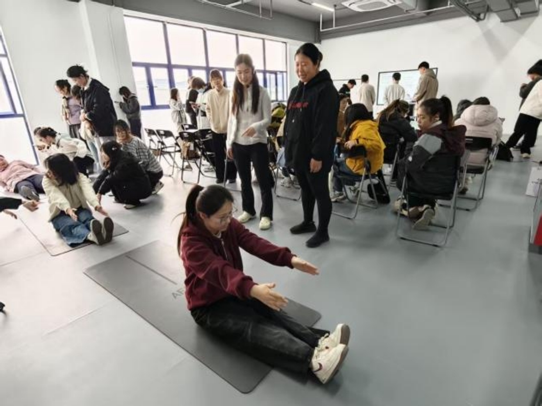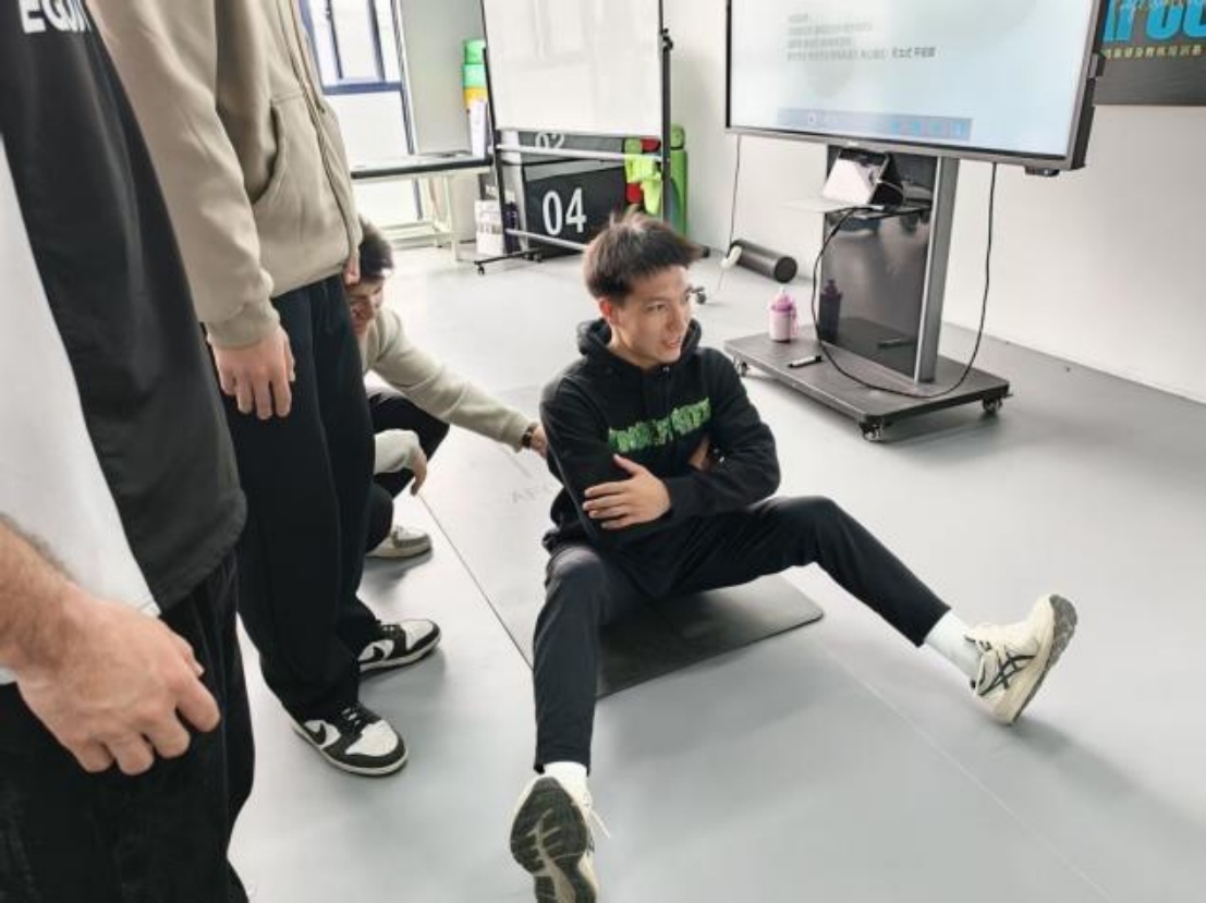 最后一项卷起评估,要求同学们以俯卧姿势双手举过头顶,从头颈开始逐节卷起脊柱,缓慢伸展至坐姿前屈,全程禁止爆发式发力。现场同学们体验后表示,该动作难度较高,达到评估满分难度大,让大家清晰认识到自身核心与脊柱功能的薄弱环节。