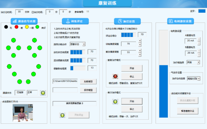 通过头戴式虚拟现实眼镜套装进行虚拟环境下的康复模式训练,将在患者视角里出现虚拟场景,进而进行情景式康复训练,提高患者参与训练的趣味性。